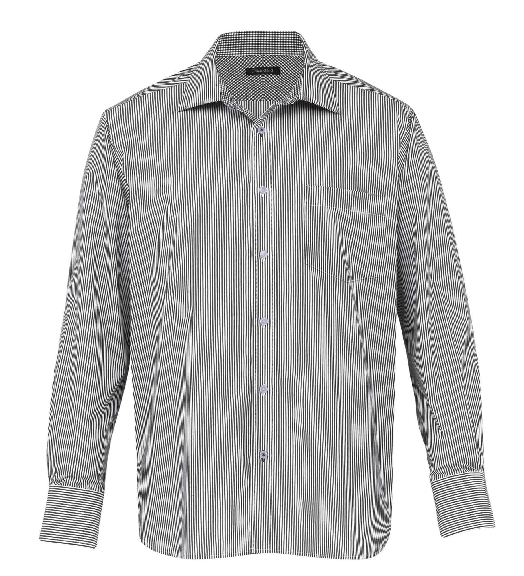 62% polyester 35% cotton|3% Lycra yarn dyed stripe|100% cotton gingham contrast inside back yoke|cuffs and collar stand|Classic fit|Fashion collar|Mitred corner detail on cuffs|Single chest pocket|Contrast stitch detailing on selected buttons|Adjustable cuff and cufflink facility