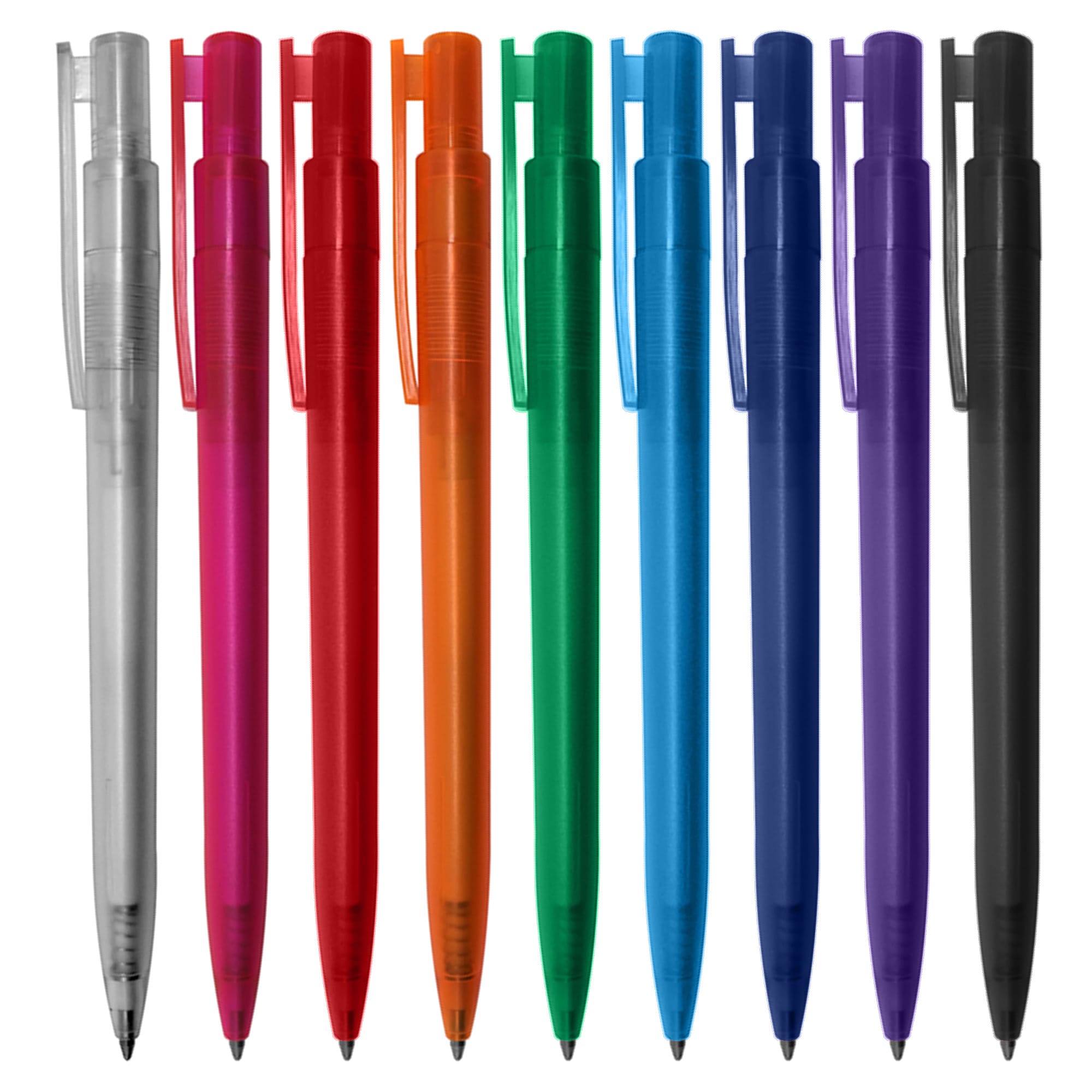 Click action European design plastic pen transparent coloured barrel and trim large printing area on clip. It has high quality German manufactured black ink refill 1800 meters writing distance tungsten carbide ball provides you with quality writing.