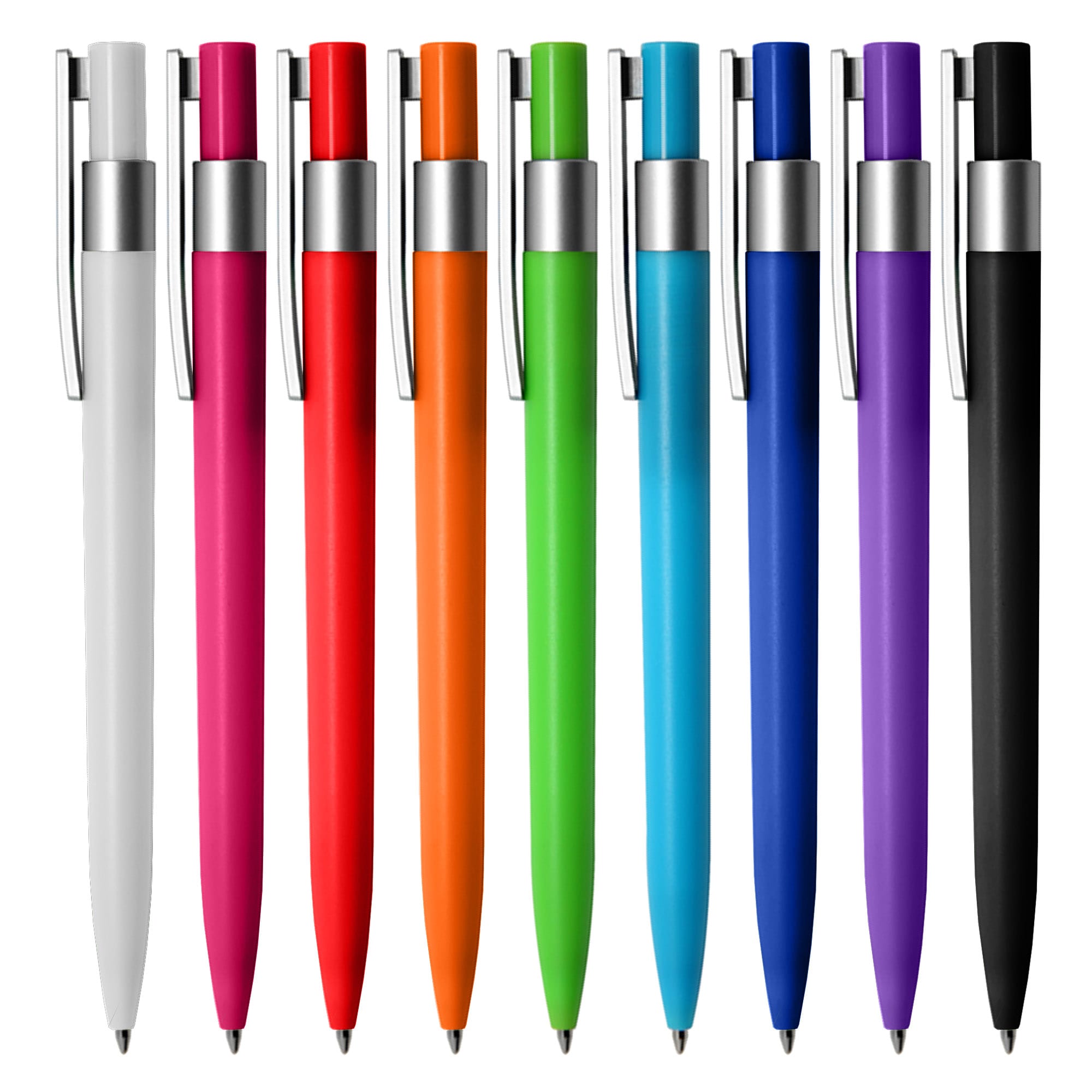 Click action European design plastic pen frosted coloured barrel with matt silver trim large printing area on clip. It has high quality German manufactured black ink refill 1800 meters writing distance tungsten carbide ball provides you with quality writing.