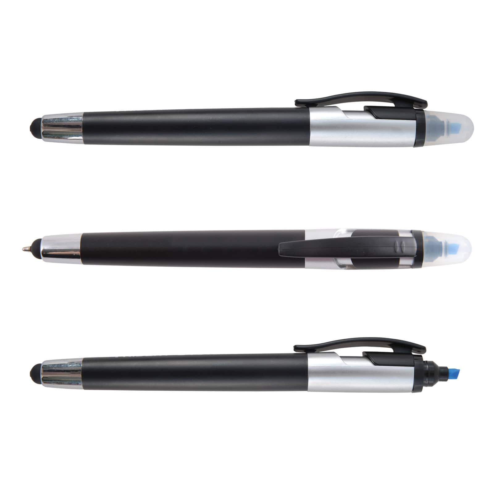 Introducing the Trident Pen / Stylus Highlighter, a versatile 3-in-1 writing instrument designed for the modern professional. This sleek ballpoint pen features a matte black and silver finish, adding a touch of sophistication to your desk. The stylus interchange ensures compatibility with all touch screen devices, making it a perfect companion for your digital needs. The chisel highlight marker, available in your choice of pink, green, orange, yellow, or blue, adds functionality for highlighting important notes. The Trident Pen is an essential tool for those who value convenience and style in their everyday tasks.