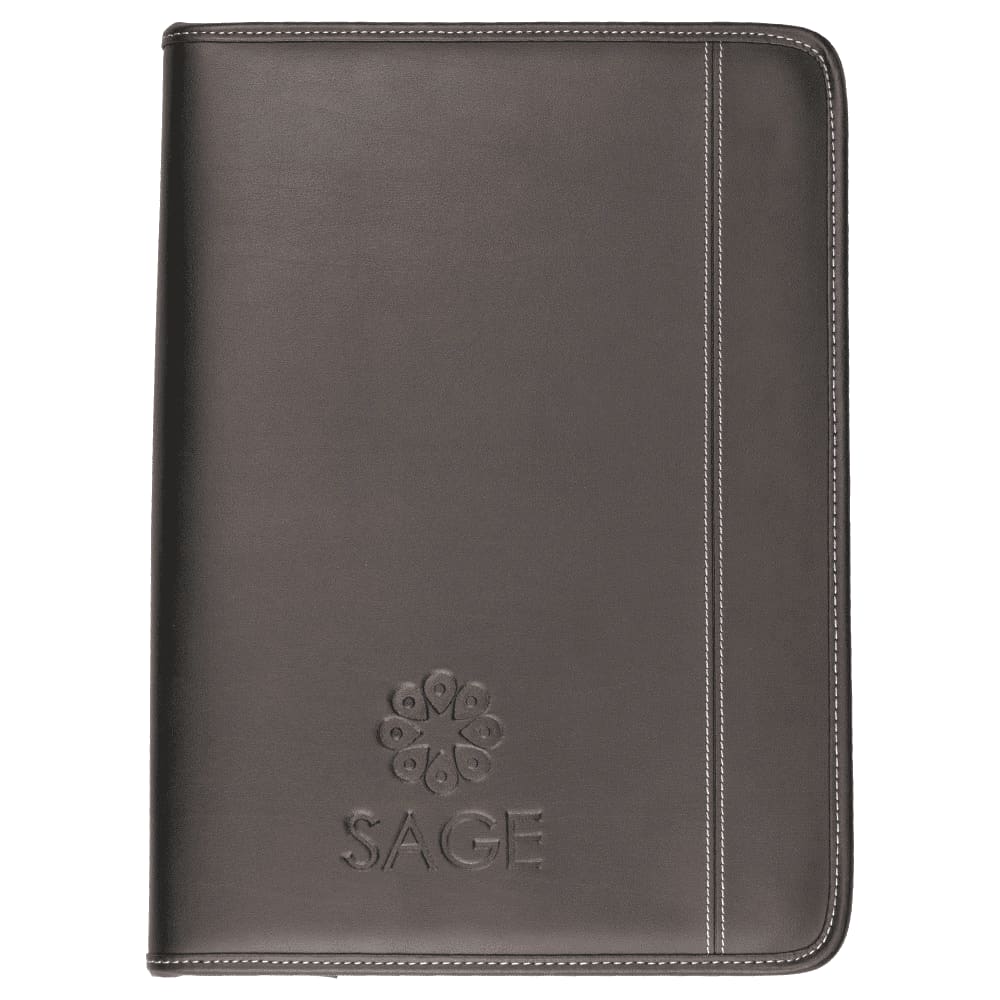 A4 size zippered compendium in koskin leather-look material with white stitching and grey EVA material contrast panels inside.