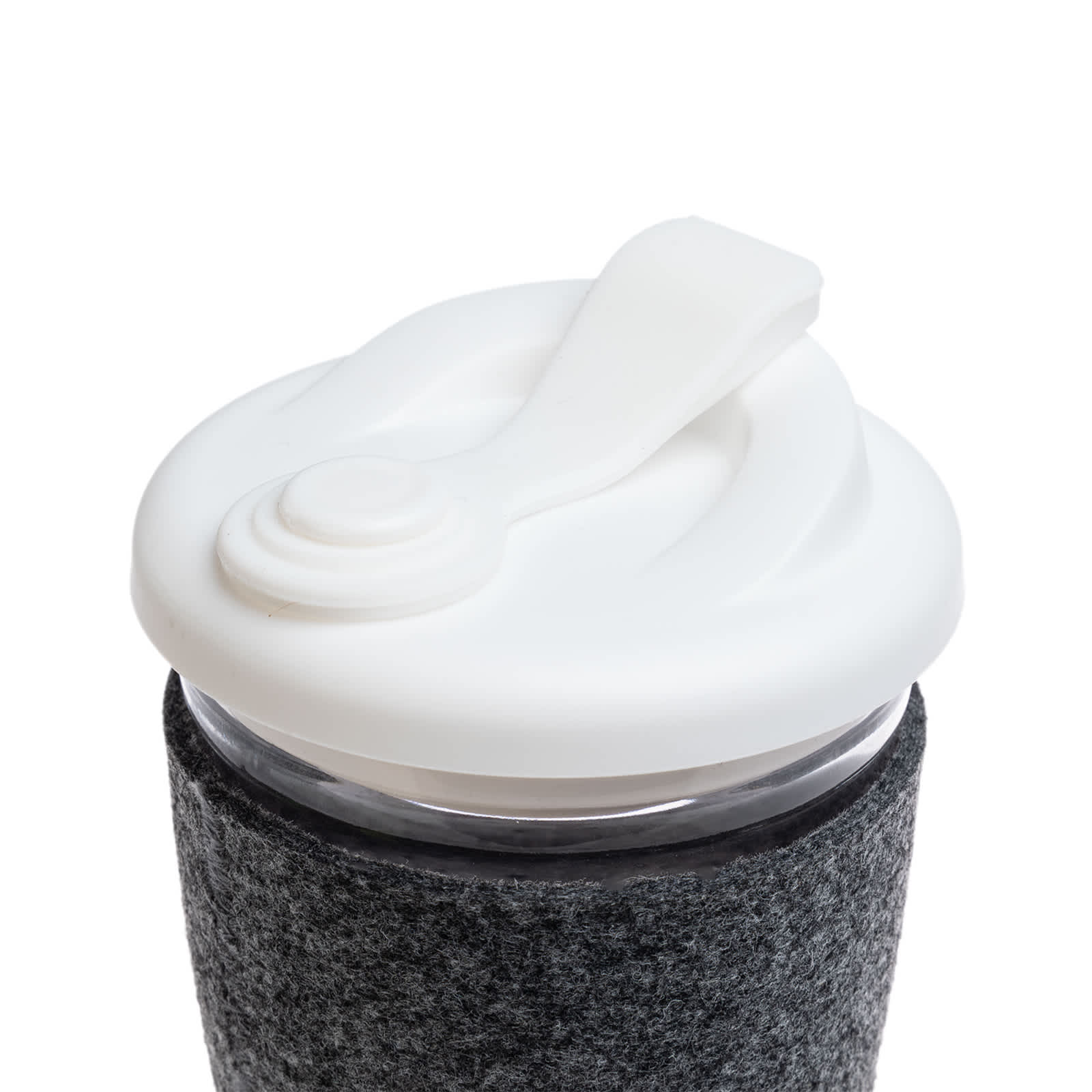 320ml glass reusable coffee cup. With secure fitting polypropylene lid silicone and a convenient silicone snap piece. Made from Borosilicate glass known for its durability and thermal shock resistance. Nominate your choice of lid and snap piece colours. Packed in a kraft gift box. Remove the band prior to washing. Eco Credentials: Reusable, sustainable, printed using renewable energy.