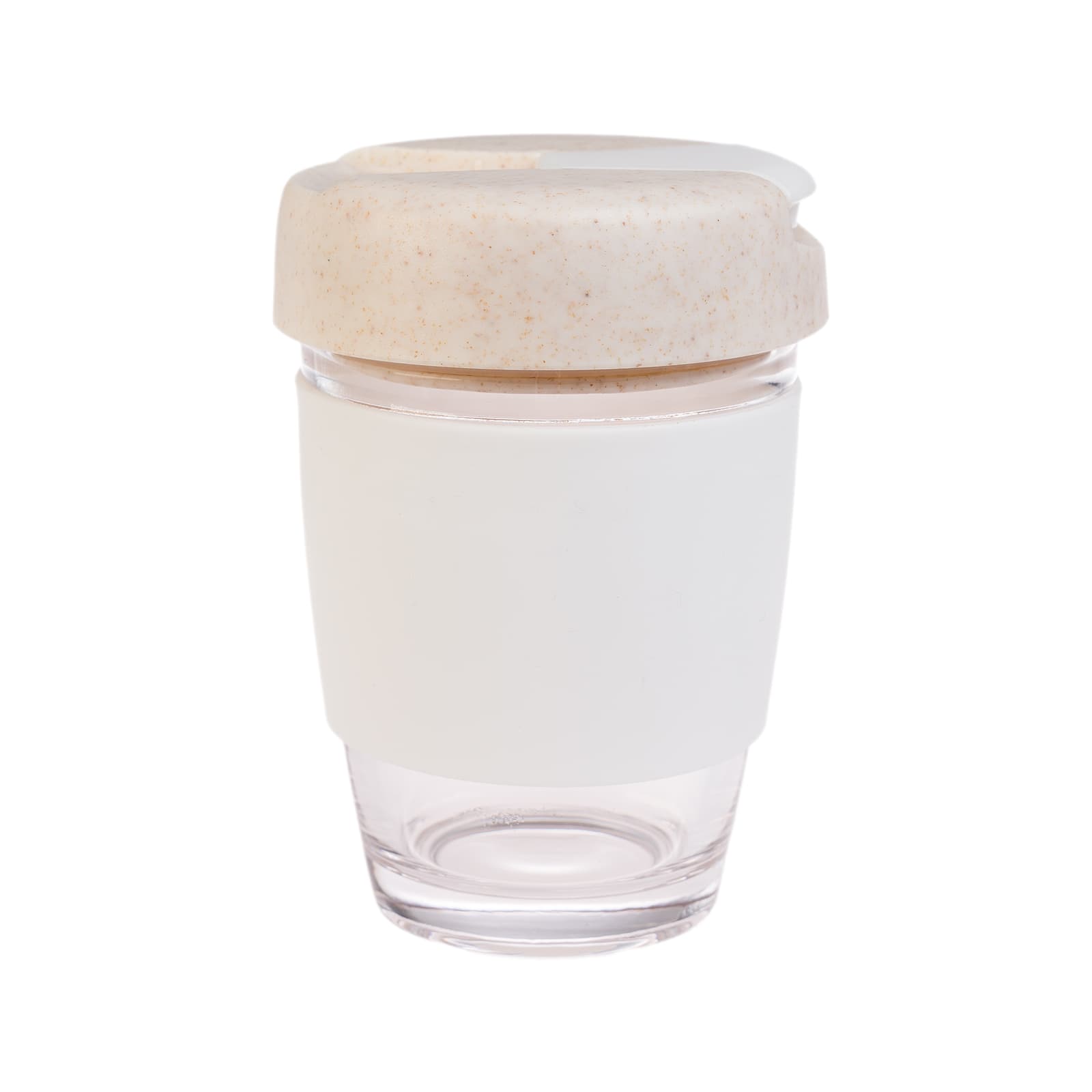 320ml glass reusable coffee cup. With silicone sleeve and eco comfort lid. Lid made from a 50% blend of wheat fibre and polypropylene. Borosilicate glass is known for its durability and thermal shock resistance. Select your choice of silicone sleeve colour. Packed in kraft gift box. For logo longevity hand washing is recommended. Eco Credentials: Reusable, sustainable, printed using renewable energy.