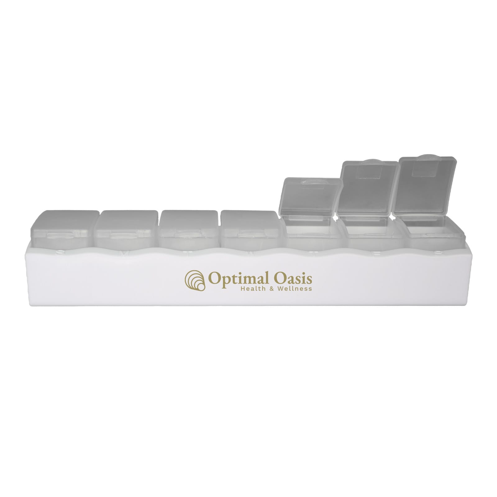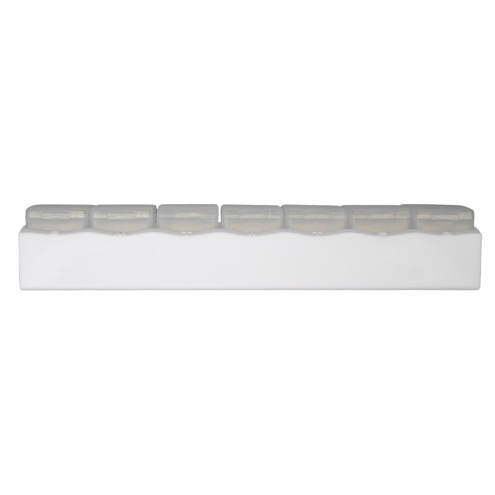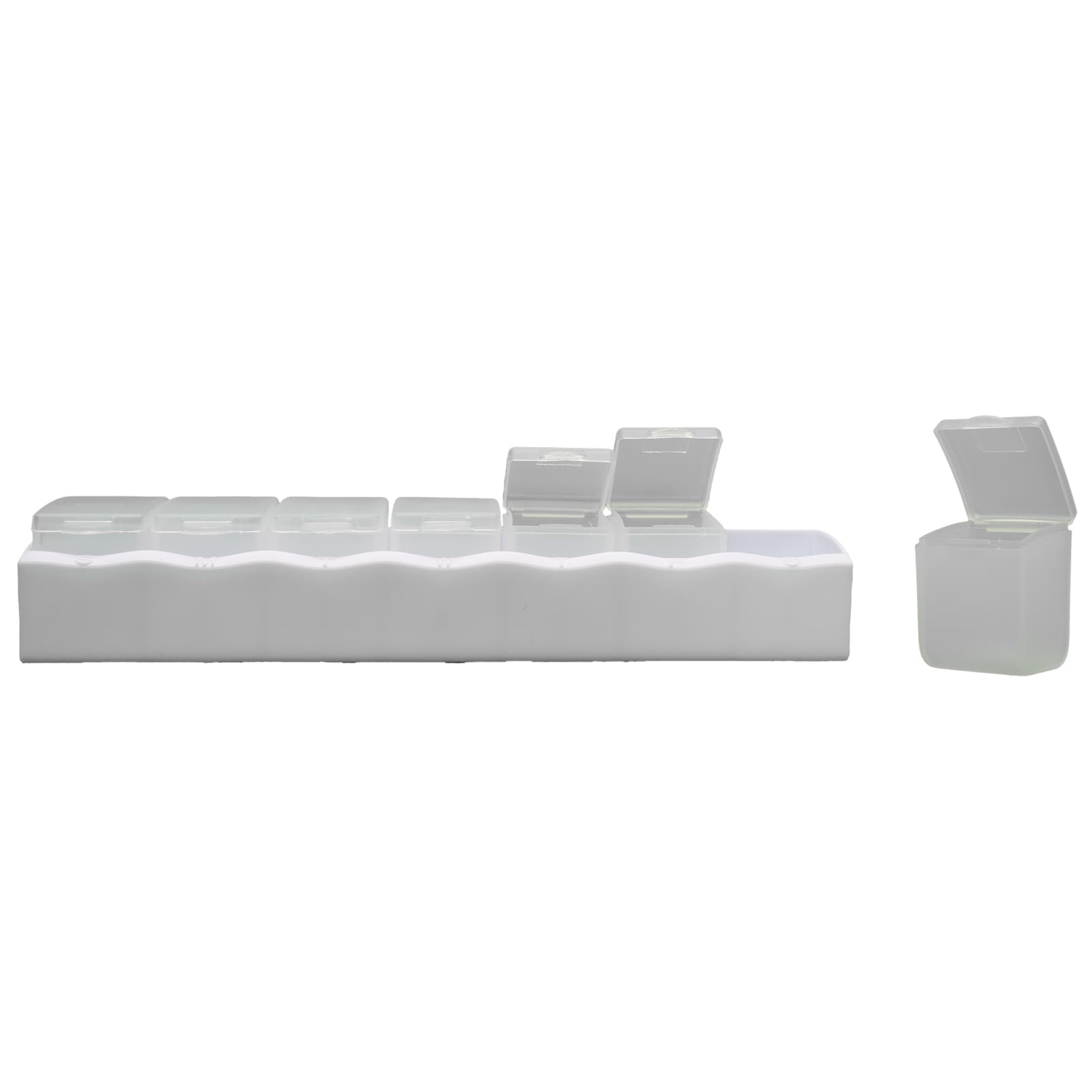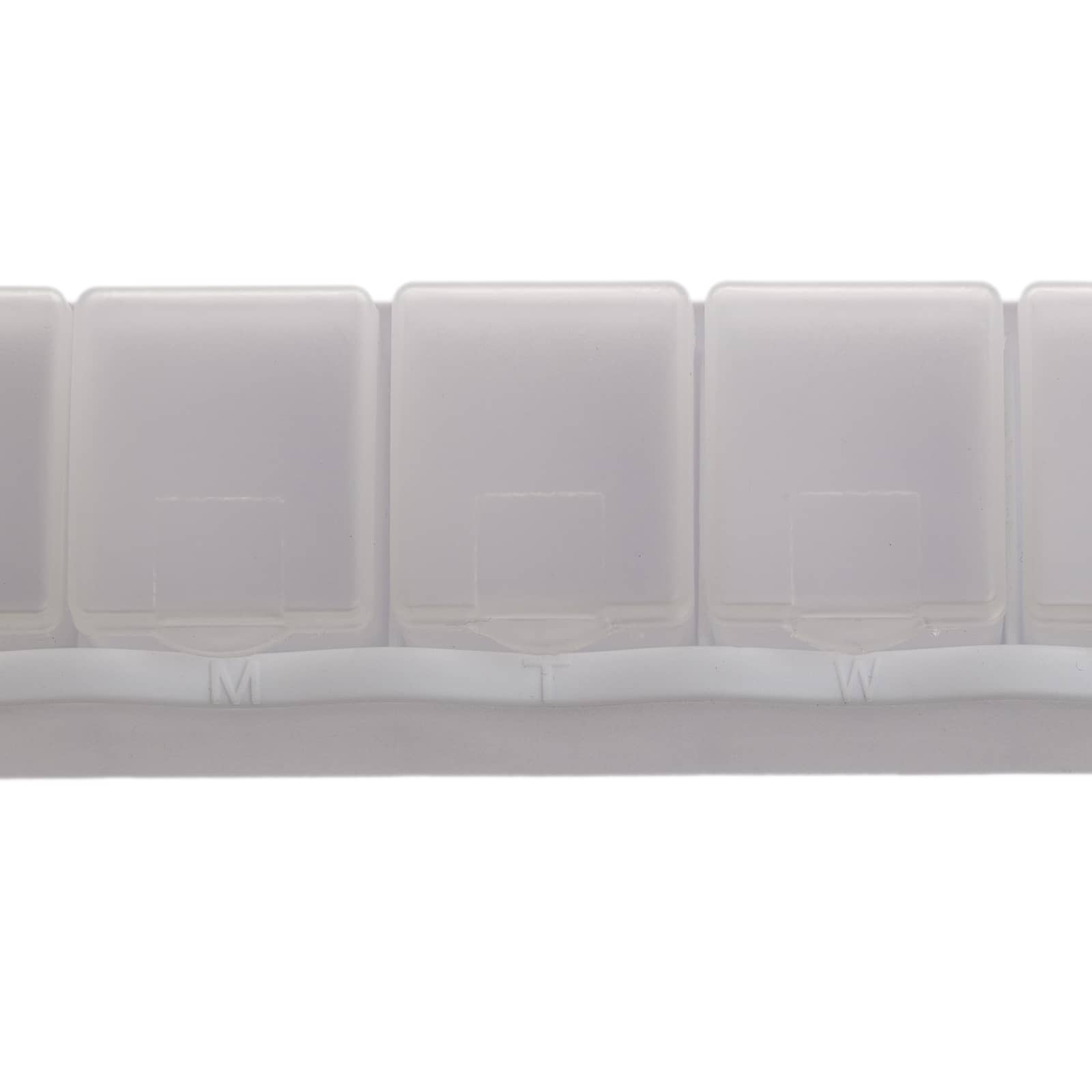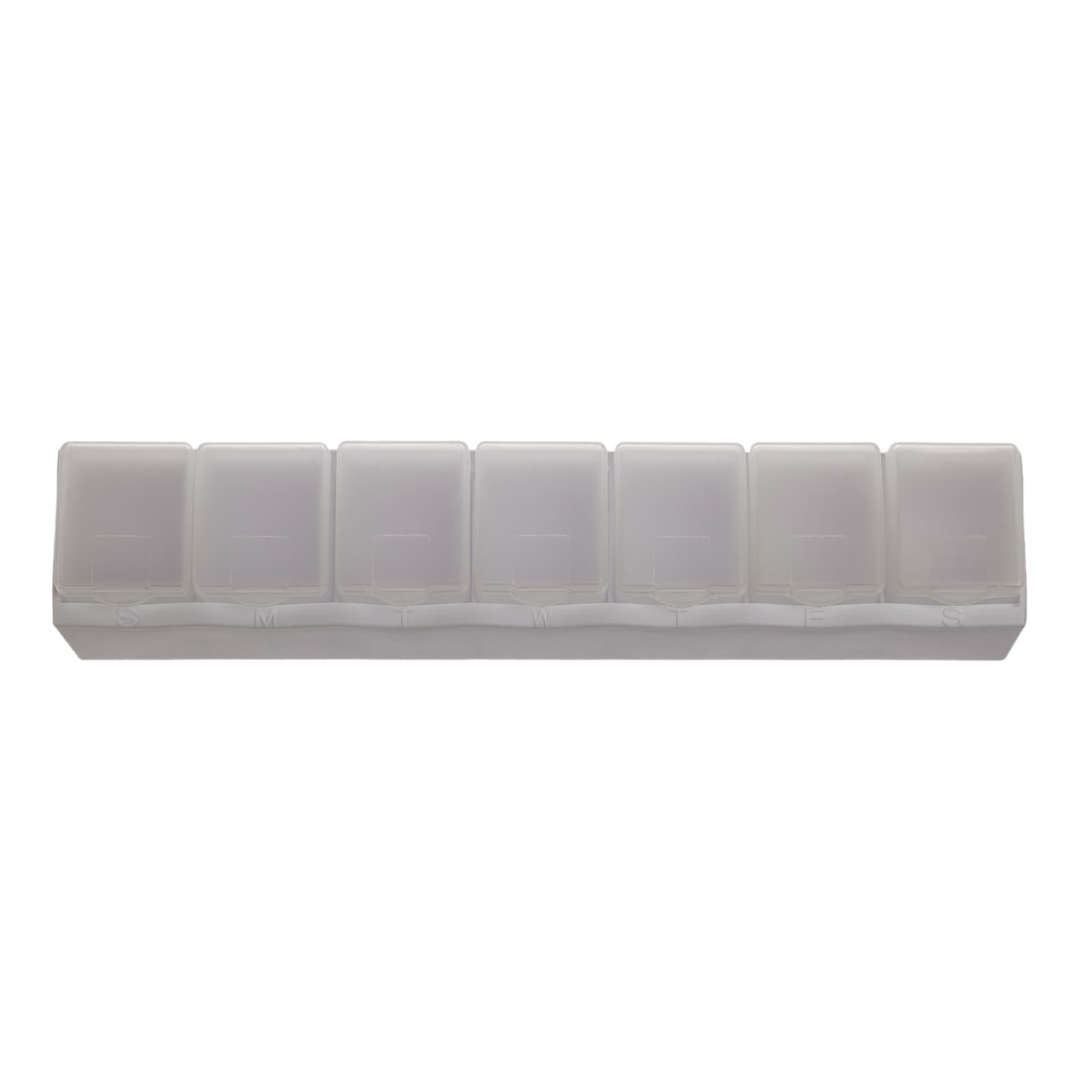 Stay organised and on top of your medication schedule with the Weekly Pill Box. Featuring seven removable compartments, each marked with the first letter of the day for easy identification, this sleek pill box has a white base and frosted containers, offering both convenience and discretion. Perfect for travel or daily use, it keeps your pills secure and easily accessible.
