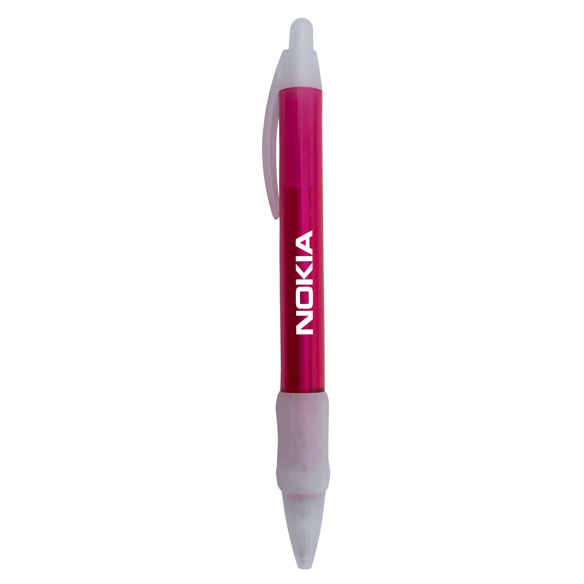 This wide-profile pen offers extra space for your branding to stand out loud and clear. A classic desk staple with a frosted clear trim, it delivers a clean look with solid promotional impact. Available with blue or black ink.