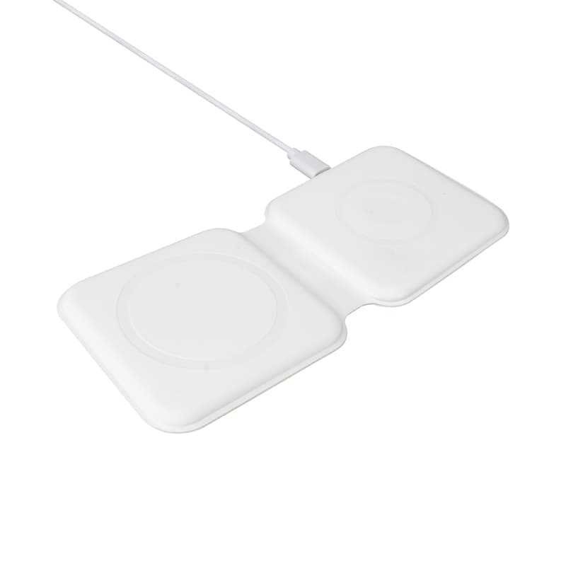 The York 2n1 magnetic wireless charger conveniently charges your compatible iPhone, iWatch, AirPods, and other Qi-certified devices. Lightweight and foldable, this dual wireless charging station charges two devices simultaneously and is ideal for travelling. Compatible with iPhone 12/12 Mini, 12 Pro/12 Pro Max, iPhone 11/11 Pro/11 Pro Max/X/XR, AirPods Pro/AirPods Pro 2, App Watch 6/SE/5/4/3/2/1. Includes a Type-C charge cable and user manual. Material: PU Leather.
